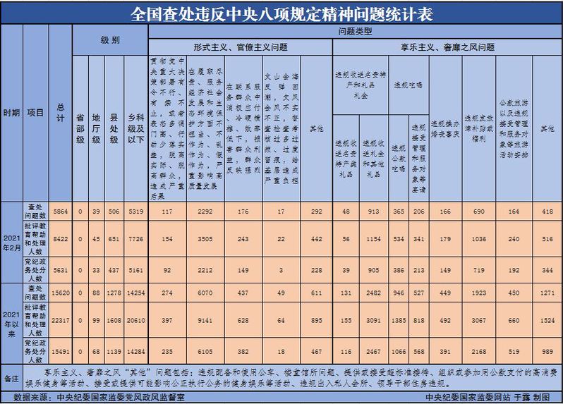 3月29日,中央纪委国家监委公布了2021年2月全国查处违反中央八项规定精神问题汇总情况。当月,全国各级纪检监察机关共查处违反中央八项规定精神问题5864起,批评教育帮助和处理8422人,其中党纪政务处分5631人。
