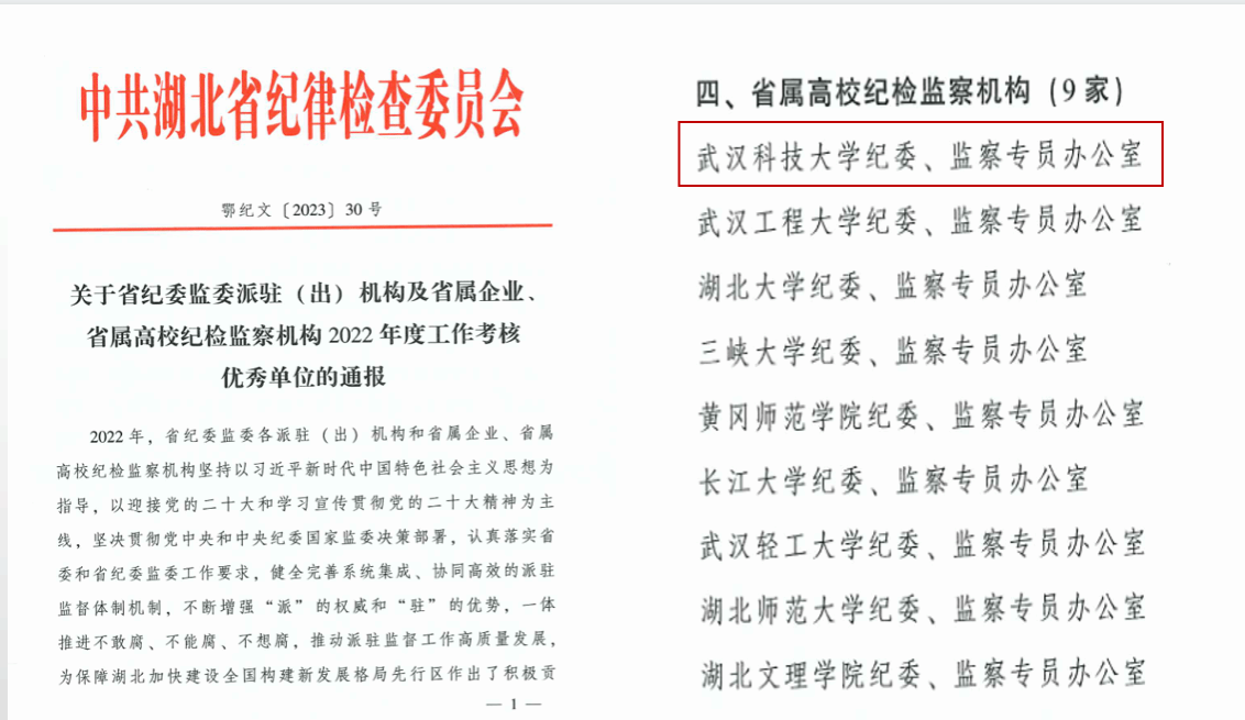 武科大网讯 近日,湖北省纪委监委发布《关于省纪委监委派驻(出)机构及省管企业、省属高校纪检监察机构2022年度工作考核优秀单位的通报》,我校纪委、监察专员办公室被评为“2022年度工作考核优秀单位”,考核排名位居首位,连续第四年被省纪委监委评为“优秀”等次。
