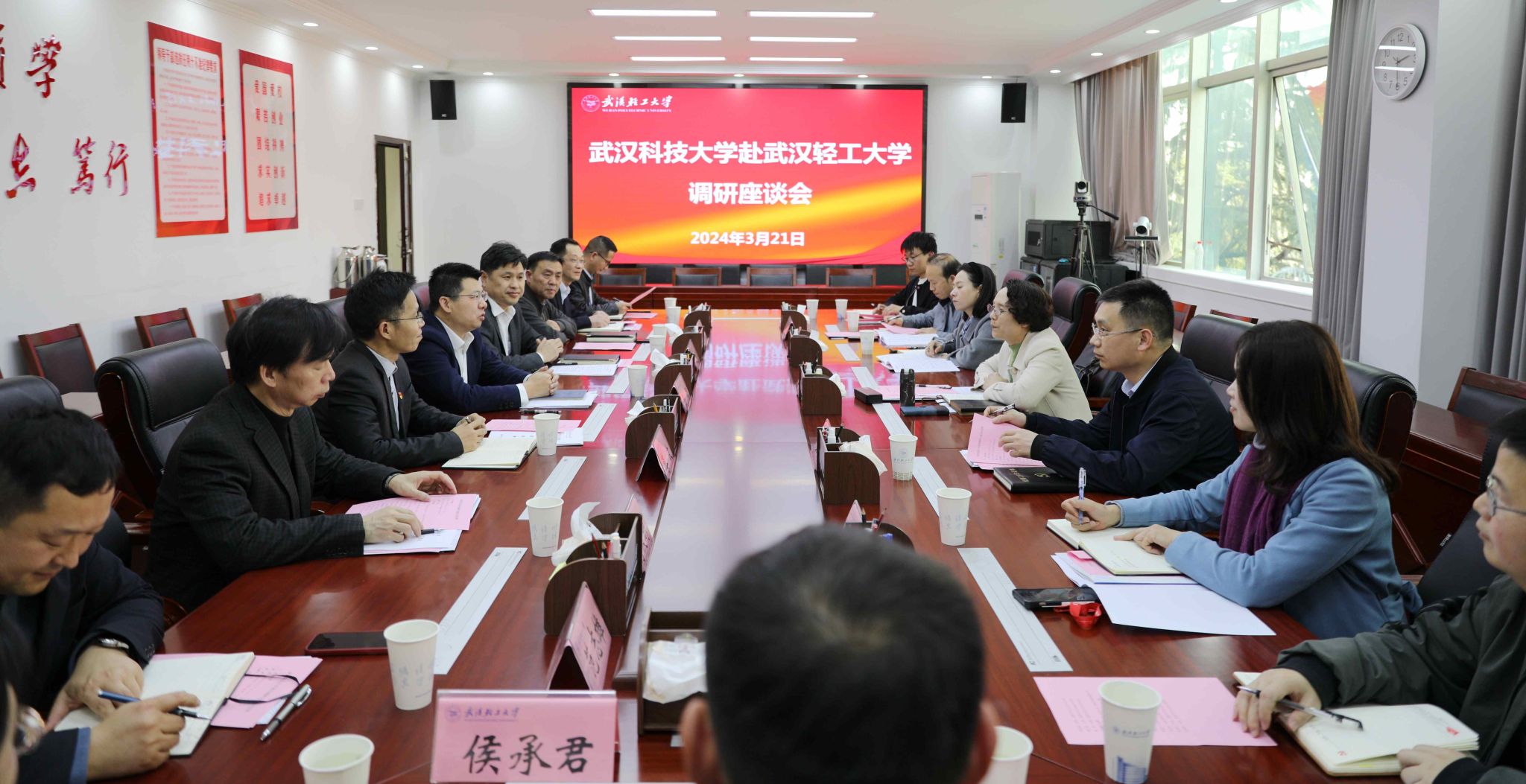 3月21日,武汉轻工大学党委书记王立兵、党委副书记沙顺利在调研座谈会前与窦先萍一行见面,对来访表示欢迎,希望两校加强交流合作、相互支持。校纪委书记、监察专员金颂主持调研座谈会,介绍了学校基本情况,党委巡察、纪委监察机构设置、人员配备及工作总体情况。表示希望双方以此次座谈交流为契机,进一步加强沟通交流、互学互鉴,加快形成纪检监察新质生产力,以高质量纪检监察、巡察工作服务保障学校高质量发展。