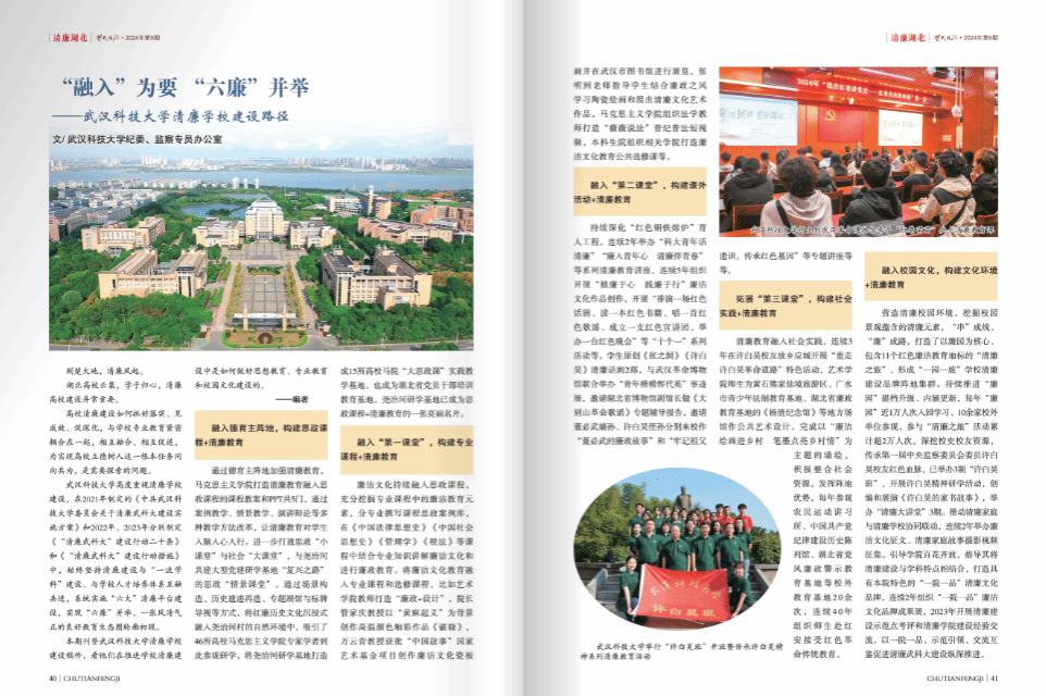 持续深化“红色钢铁熔炉”育人工程,连续2年举办“科大青年话清廉”“廉入青年心 清廉伴青春”等系列清廉教育讲座,连续第5年组织开展“植廉于心 践廉于行”廉洁文化作品创作,开展“排演一场红色话剧、读一本红色书籍、唱一首红色歌谣、成立一支红色宣讲团、举办一台红色晚会”等“十个一”系列活动等。学生原创《张之洞》《许白昊》清廉话剧2部,与武汉革命博物馆联合举办“青年楷模恽代英”事迹展,邀请湖北省博物馆副馆长做《大别山革命歌谣》专题辅导报告,邀请董必武嫡孙、许白昊侄孙分别来校作“董必武的廉政故事”和“牢记祖父遗训,传承红色基因”等专题讲座等等。