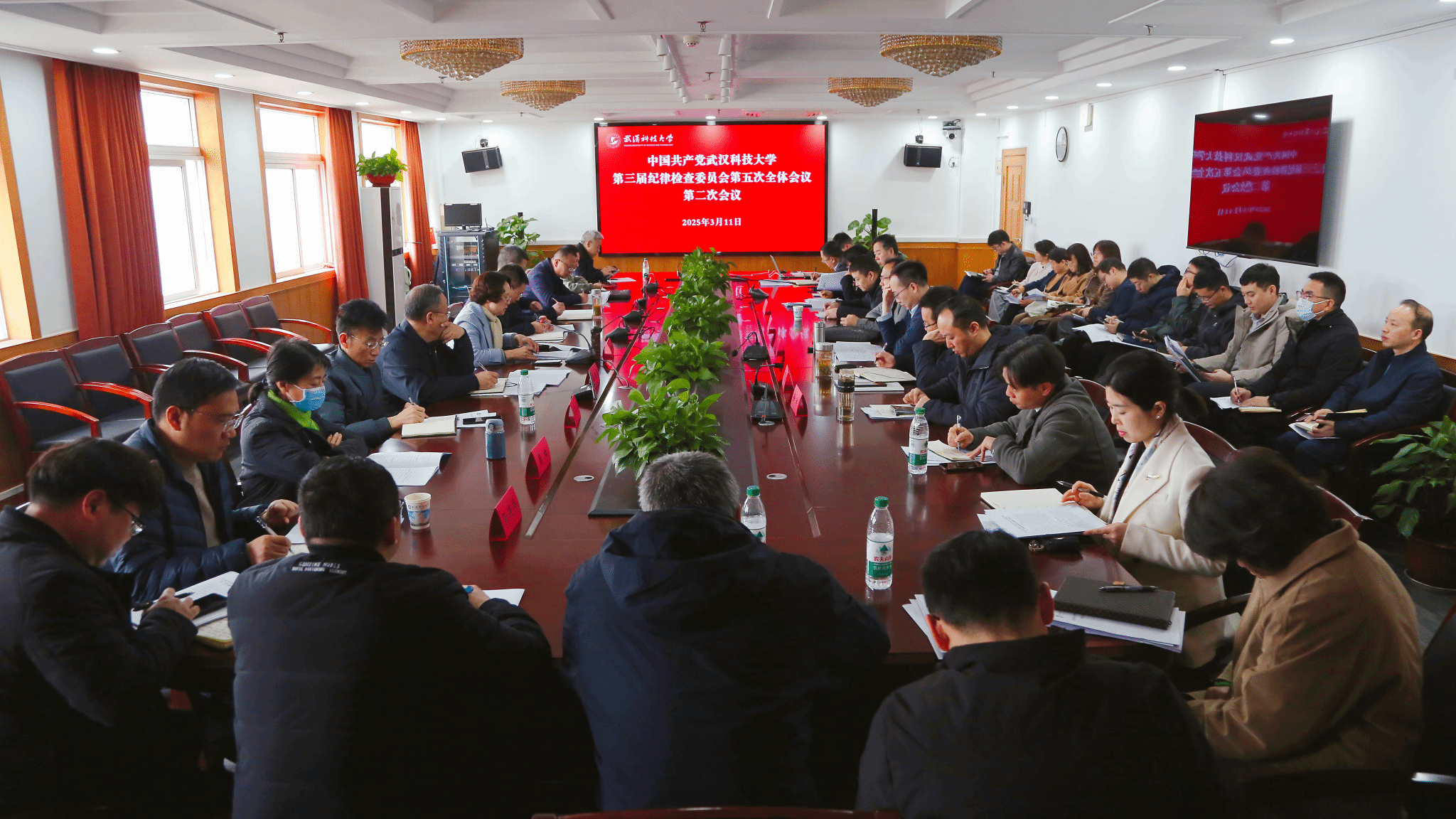 3月11日上午,bevictor伟德官网武汉科技大学第三届纪律检查委员会第五次全体会议在青山校区十八楼报告厅举行。校党委书记徐雁冰出席会议并讲话,全体校领导、党委委员、纪委委员、党群部门负责人、二级党组织书记、二级纪委书记(纪检委员)、专职纪检监察干部、巡察干部参加会议。全会深入贯彻习近平新时代中国特色社会主义思想,全面贯彻党的二十大和二十届二中、三中全会精神,坚决贯彻习近平总书记考察湖北重要讲话精神,认真落实二十届中央纪委四次全会、省纪委十二届四次全会部署和学校党委工作要求,总结2024年学校纪检监察工作,部署2025年任务,审议通过了校党委常委、纪委书记窦先萍代表纪委所作的《纵深推进党风廉政建设和反腐败斗争 为谱写新征程教育强国建设武科大实践新篇章提供坚强保障》工作报告。