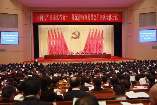 1月17日至18日,中共湖北省第十一届纪律检查委员会第四次全体会议在武昌举行。出席全会的省纪委委员50人,列席328人。省委书记蒋超良出席全会并讲话。省委、省人大常委会、省政府、省政协领导同志,省高级人民法院院长、省人民检察院检察长出席会议。全会认真传达学习、贯彻落实十九届中央纪委四次全会精神,总结回顾2019年纪检监察工作,研究部署2020年任务;听取10个地方和单位党委(党组)主要负责同志述责述廉。审议通过了省委常委、省纪委书记、省监委主任王立山代表省纪委常委会所作的《充分发挥纪检监察职能作用 为我省全面建成小康社会提供坚强保障》工作报告。