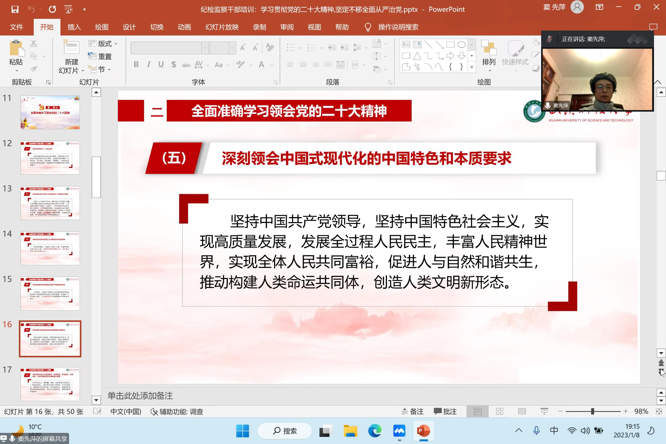 窦先萍作《学习贯彻党的二十大精神,坚定不移全面从严治党 以纪检监察工作的高质量发展推动学校教育事业高质量发展》专题辅导报告,结合理论阐释和实践案例,从四个方面系统诠释了学习宣传贯彻党的二十大精神的重大现实意义和深远历史意义,强调了全面准确学习领会党的二十大精神需着重把握的九个核心要点,回顾了纪检监察十年“高举旗帜”“两个维护”“反腐惩恶”“整饬作风”“改革赋能”“锻造铁军”等六个版块重点工作,并对学校纪检监察系统深入学习贯彻党的二十大精神、以全面从严治党不断推进党的自我革命、为学校高质量发展提供坚强纪律作风保障作出了具体部署。