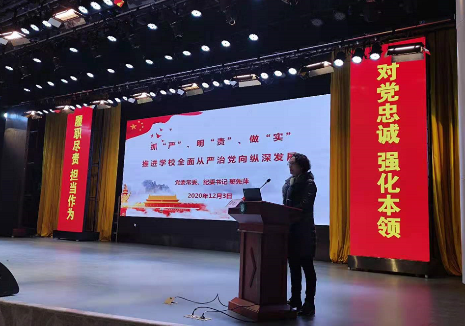 学校党委常委、纪委书记窦先萍同志以《抓“严”、明“责”、做“实”推进学校全面从严治党向纵深发展》为题进行了主题报告。报告结合新时代背景下全面从严治党的形势与挑战,总结了当前高校全面从严治党常见的问题与不足,介绍了我校在推进全面从严治党方面已经开展的一些探索与实践,就进一步推动学校全面从严治党工作高质量发展做出指示和布置,对全校纪检监察干部进一步履职尽责、担当作为提出了要求和建议。