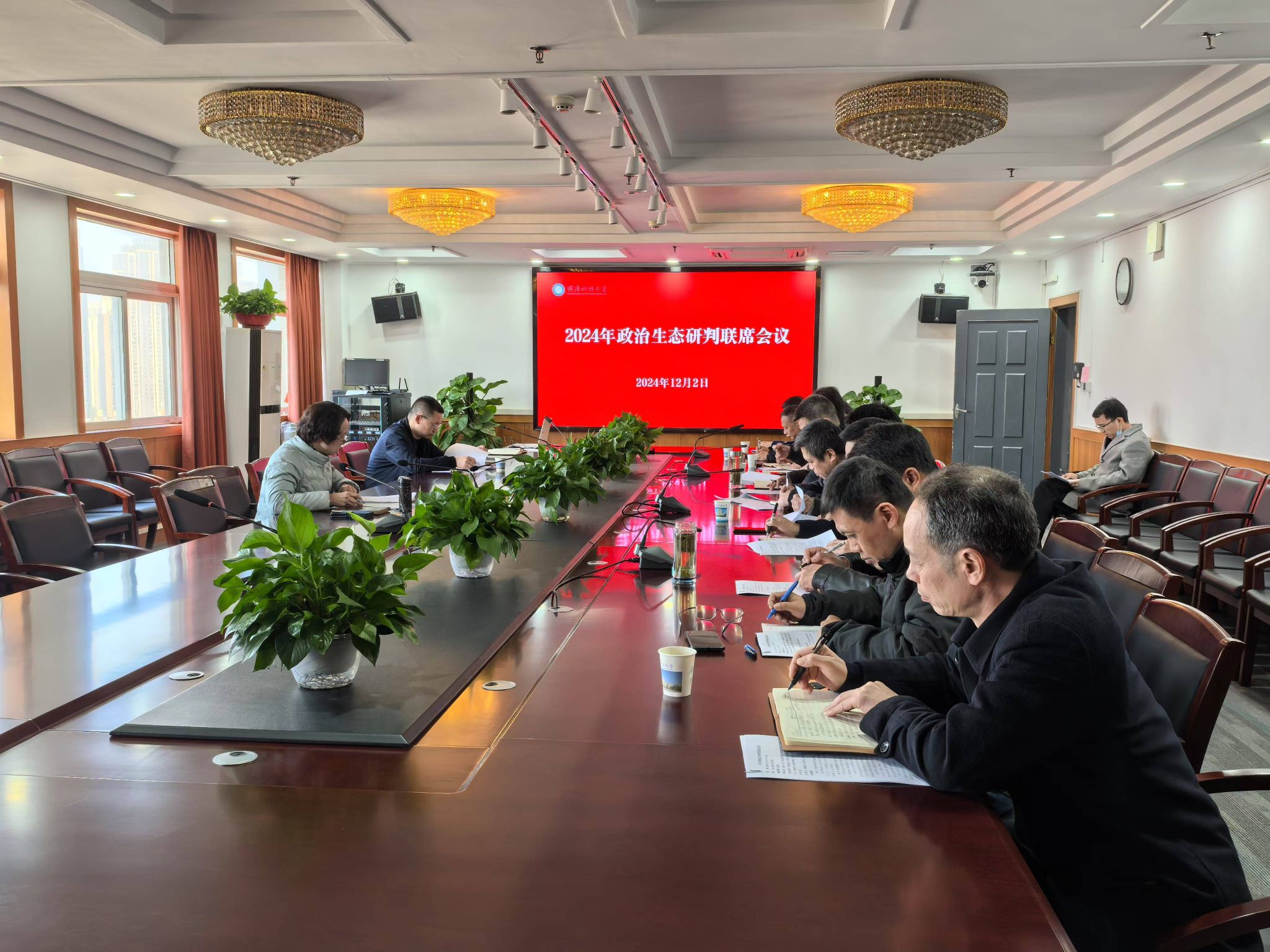 党政办公室、纪委监察专员办公室、党委组织部、党委宣传部、党委统战部、发展规划与学科建设处、人事处、财务处、审计处、国有资产与实验室管理处、保卫处、后勤保障部、网络信息中心等学校政治生态联席会议成员单位负责人参加会议。