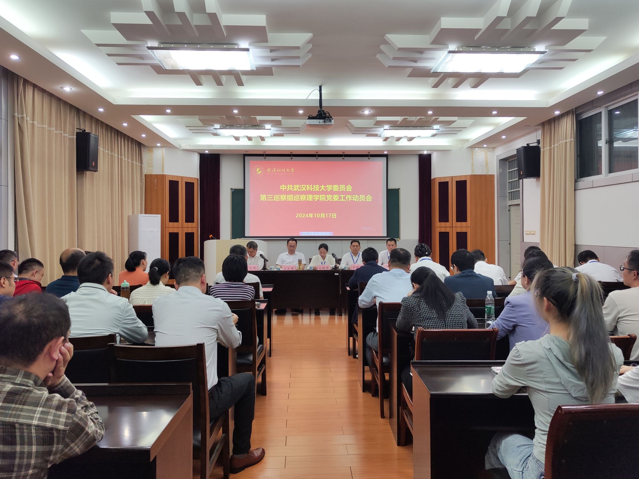 根据学校党委统一部署,10月17日下午,党委第三巡察组巡察理学院党委工作动员会议在黄家湖校区教二楼22515报告厅召开。党委第三巡察组组长毛晓丹出席并作动员讲话,理学院党委书记王文涛作表态发言。党委第三巡察组副组长李猛刚、雷鸣,第三巡察组全体成员,理学院领导班子成员参加会议,学院科级以上干部、系部主任、支部书记、教授代表及学生代表列席会议。大会由学院院长丁义明主持。